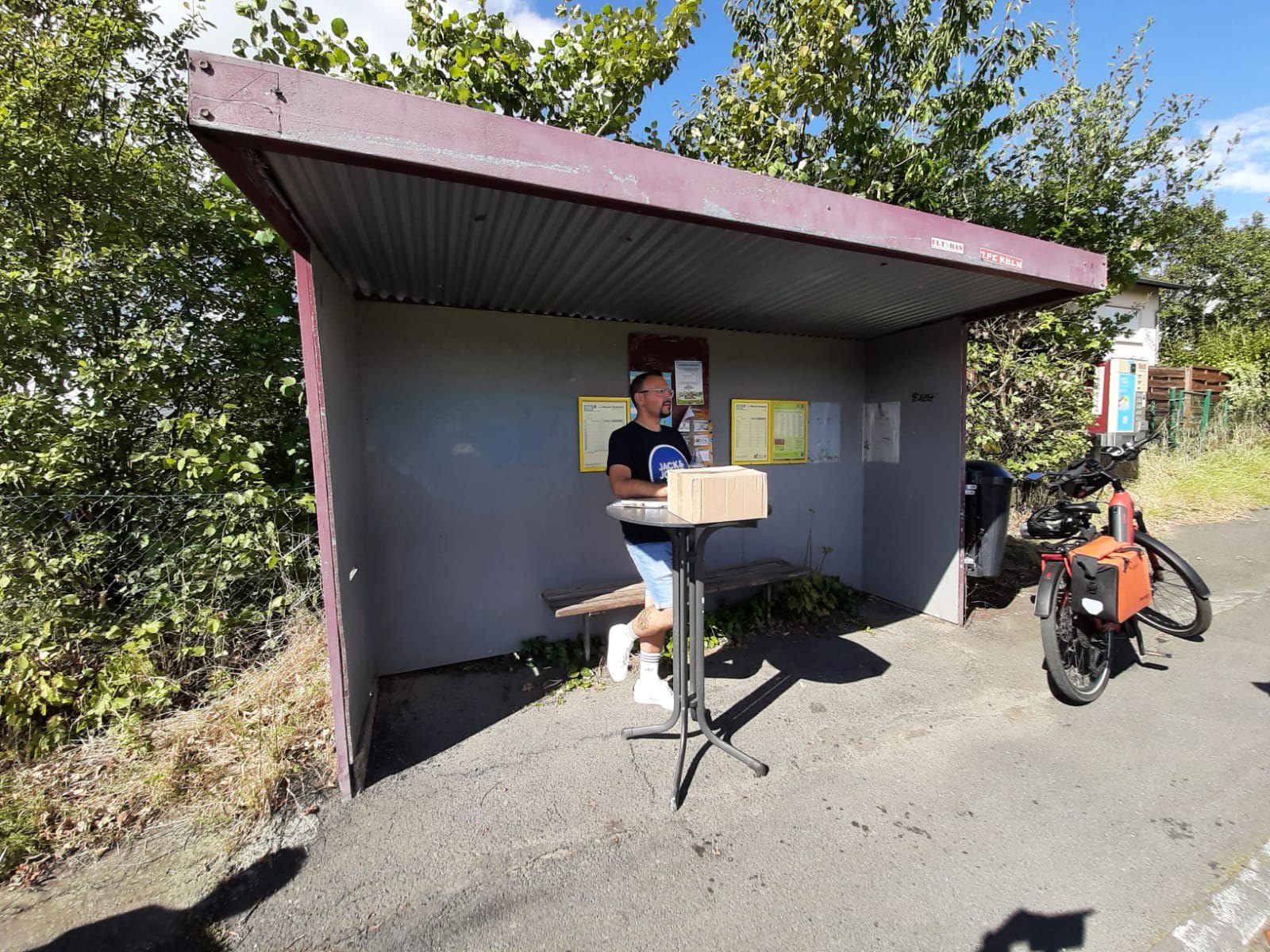 Unser Vorsitzender Marcel ließ es sich nicht nehmen, alle Stände zu besuchen, bevor er seinen Posten in der Bushaltestelle „An den Eichen“ einnahm. Hier hatten alle Dorfbewohner die Gelegenheit ihre im Vorfeld erhaltenen Stimmzettel zur Neugestaltung der Bushaltestelle in die Wahlurne zu werfen und sich über die kommenden Aktionen zu informieren.