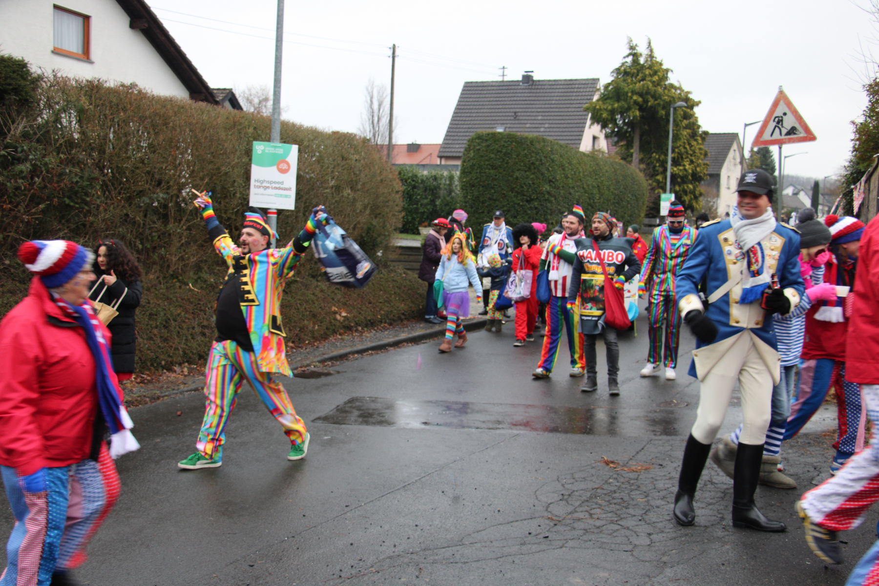 Es wurden Kamelle geschmissen und gefeiert. Einige Anwohner haben es sich nicht nehmen lassen, den Zugweg zu schmücken und empfingen die Zugteilnehmer mit Musik und Moderation vom Wegesrand.