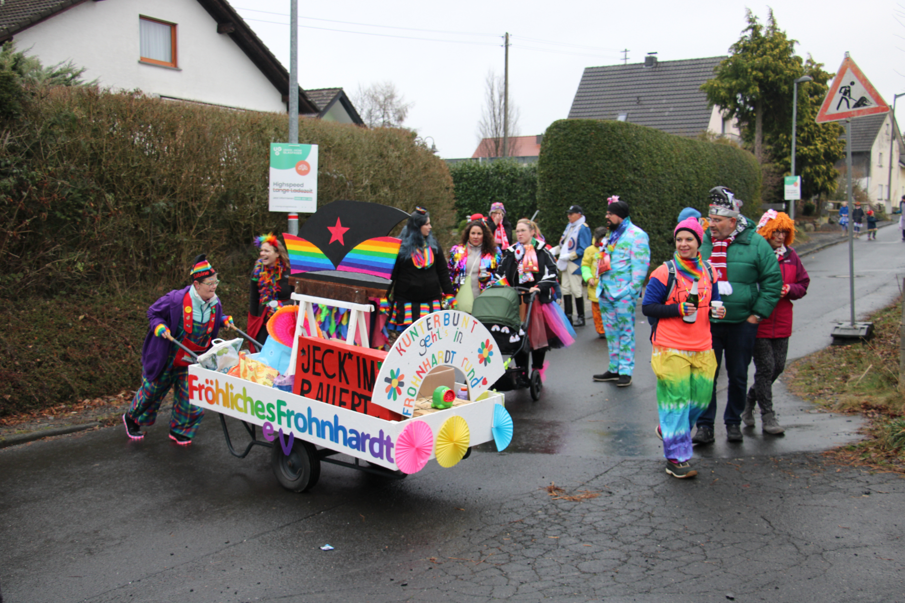 Nach dem der Zug um 14:11 pünktlich startete, machte die Narrenzunft Oberpleis mit einer Abordnung von Funken, Zunftsternen und Elferräten den Anfang. Gleich im Anschluss folgten unsere Nachbarn der KG Eisbach. Den Abschluss unserer kleinen karnevalistischen Wandergruppe bildete unser Verein Fröhliches Frohnhardt e.V. direkt mit dem neu gestaltem Handwagen der allen Zuschauern stolz das diesjährige Frohnhardter Motto präsentierte: „Kunterbunt geht’s in Frohnhardt rund„. Ein riesen Spaß für Groß und Klein!